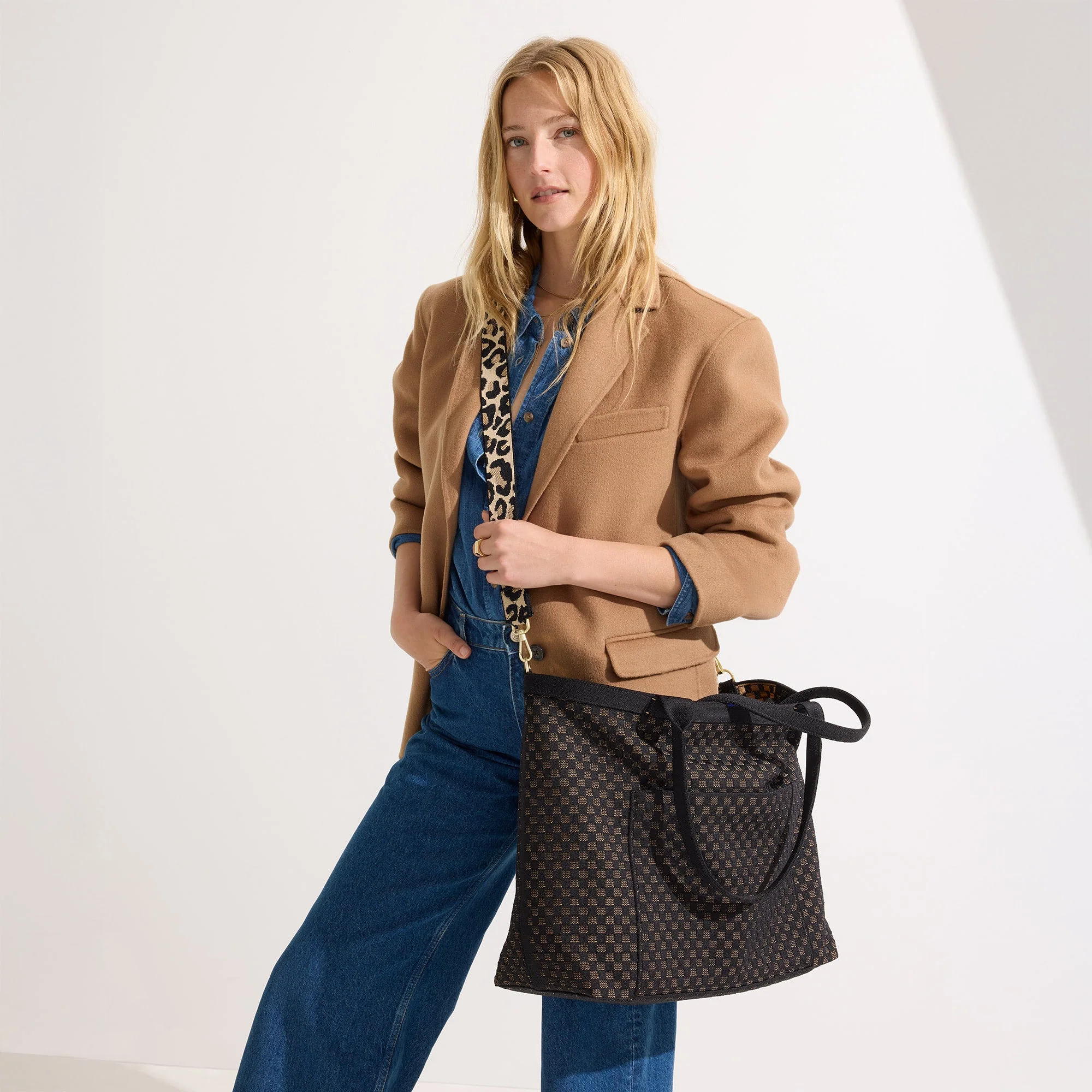 - Lightweight, flexible design in a black and camel basketweave pattern.