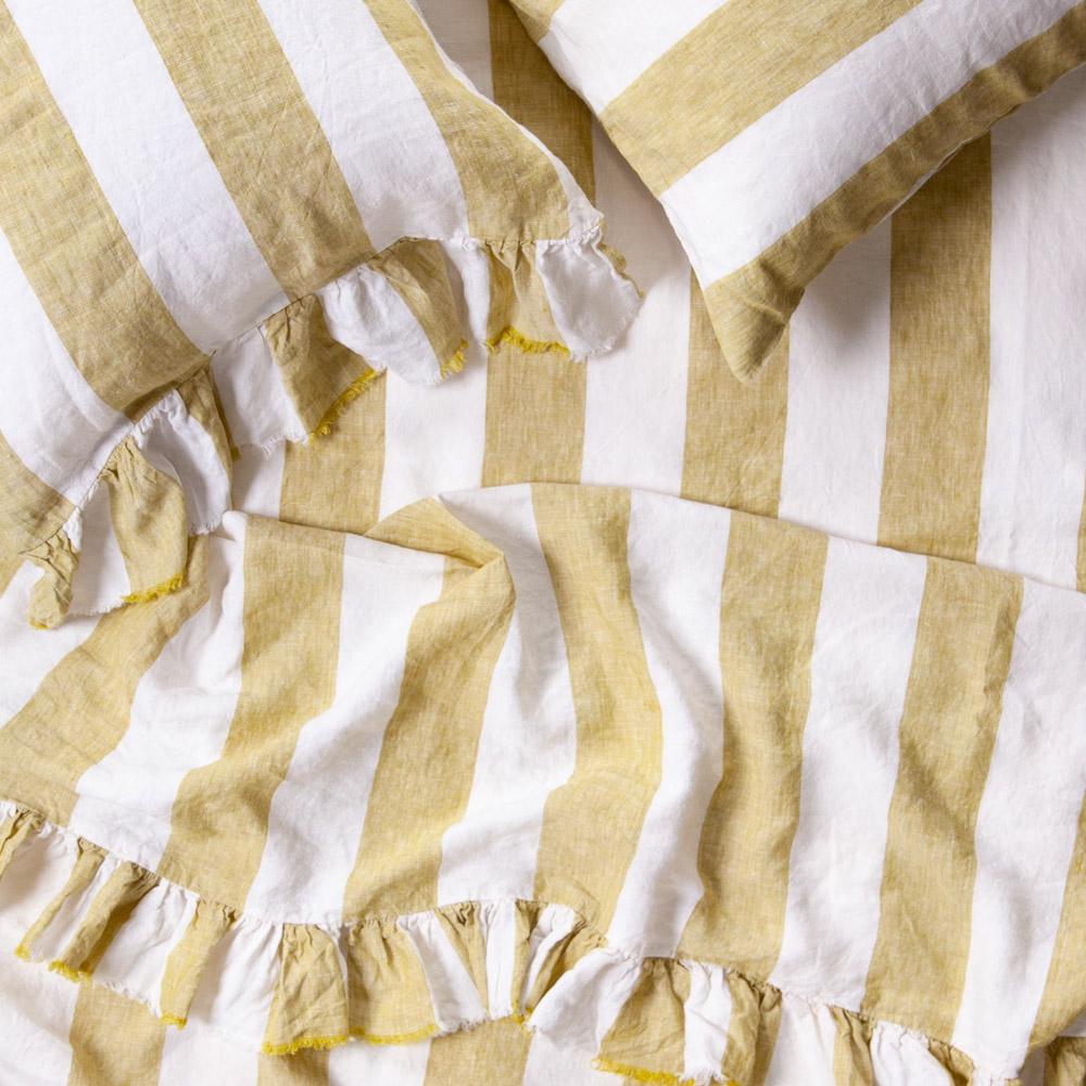 100% French Flax Linen Ruffle Pillowcase Set in a natural Kelp Stripe. Over time the linen will become softer and more beautiful.